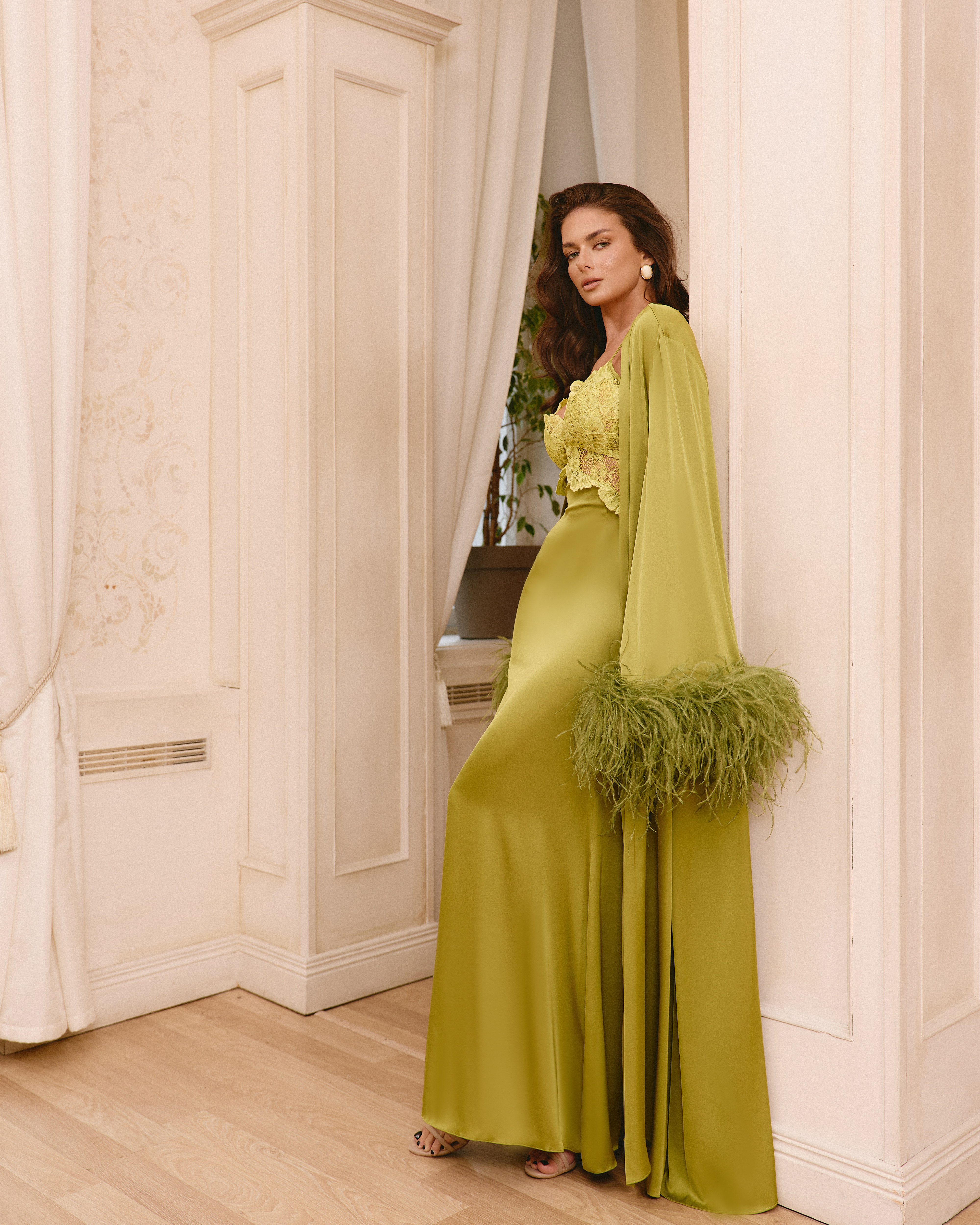Накидка з костюму NAOMI Тканина: шовковий сатин, декорована натуральним пірʼям страуса. Усі вироби відшиваються за індивідуальними мірками та не підлягають обміну та поверненню, для замовлення необхідно вказати зріст, обʼєм грудей, талії та стегон! NAOMI cape (from the suit set) Fabric: silk satin, decorated with natural ostrich feathers. All items are made according to individual measurements. To place an order, please provide your height and bust, waist, and hip measurements.