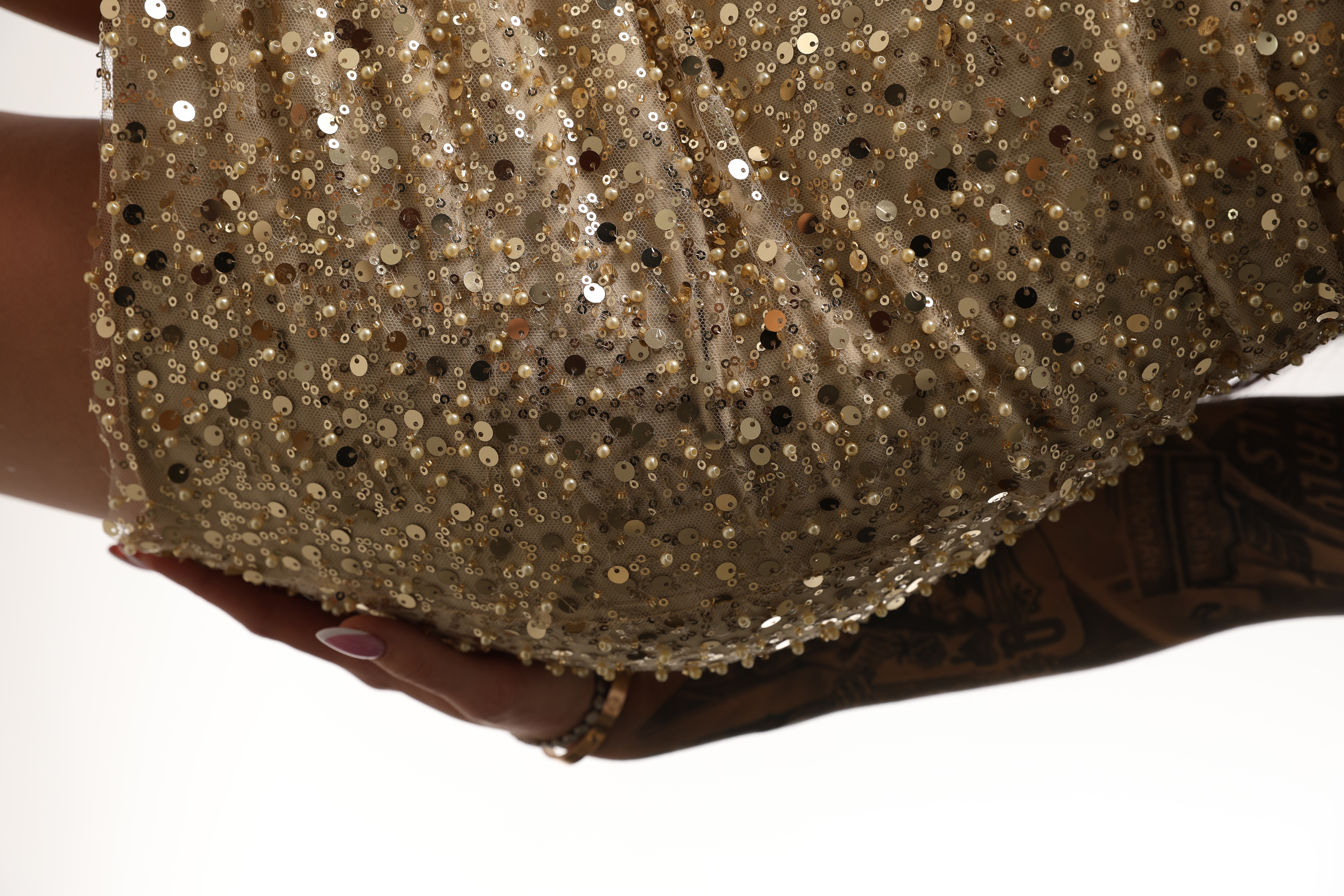 Виготовлена з розшитої вручну сітки, трикотажна підкладка, позаду застібка та блискавка.