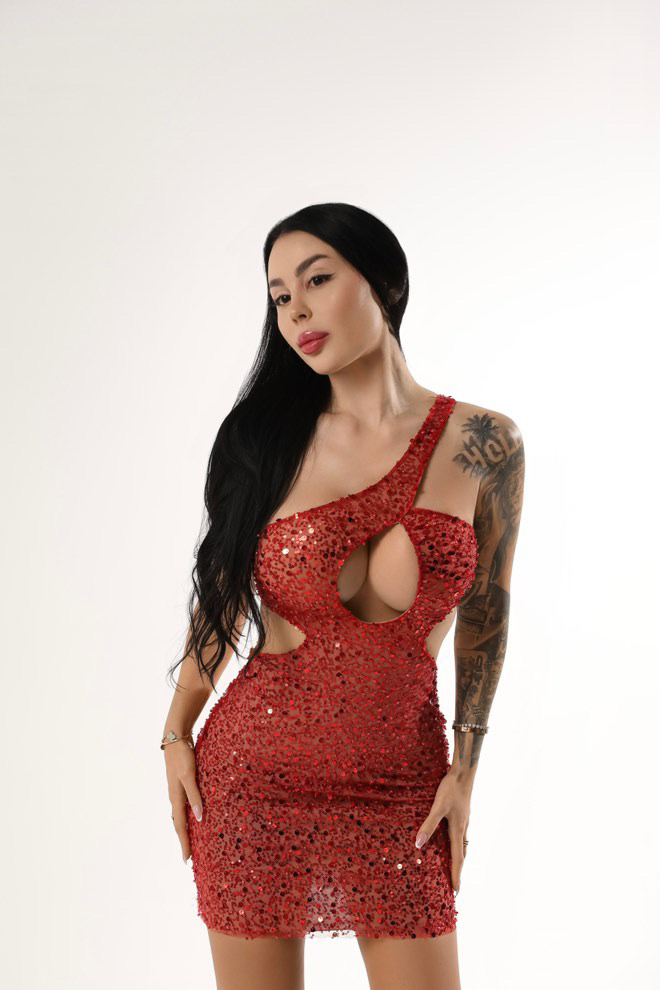 Міні-сукня PROVOCATEUR з асиметричними вирізами та відкритою спиною. Виготовлена з розшитої вручну сітки, трикотажна підкладка, позаду застібка та блискавка. Кольори: золотий, червоний. Розмір L виконується під замовлення клієнта, не підлягає обміну та поверненню!