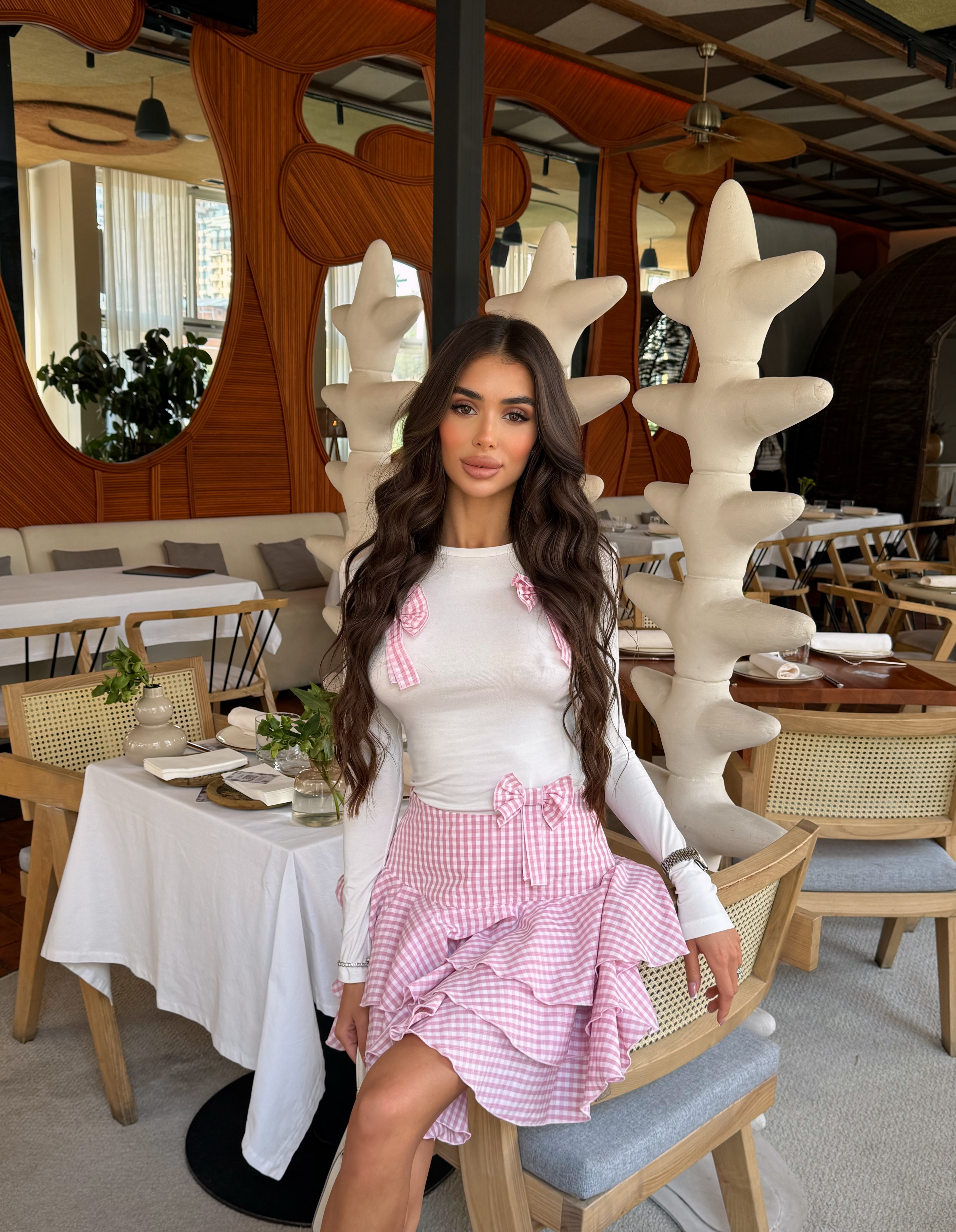 Костюм з двох одиниць: лонгслів - італійський трикотаж, декорований бантами, спідниця з рюшами - принтований котон, збоку на блискавці. Кольори: рожевий, чорний Розмір L виконується під замовлення клієнта, не підлягає обміну та поверненню!