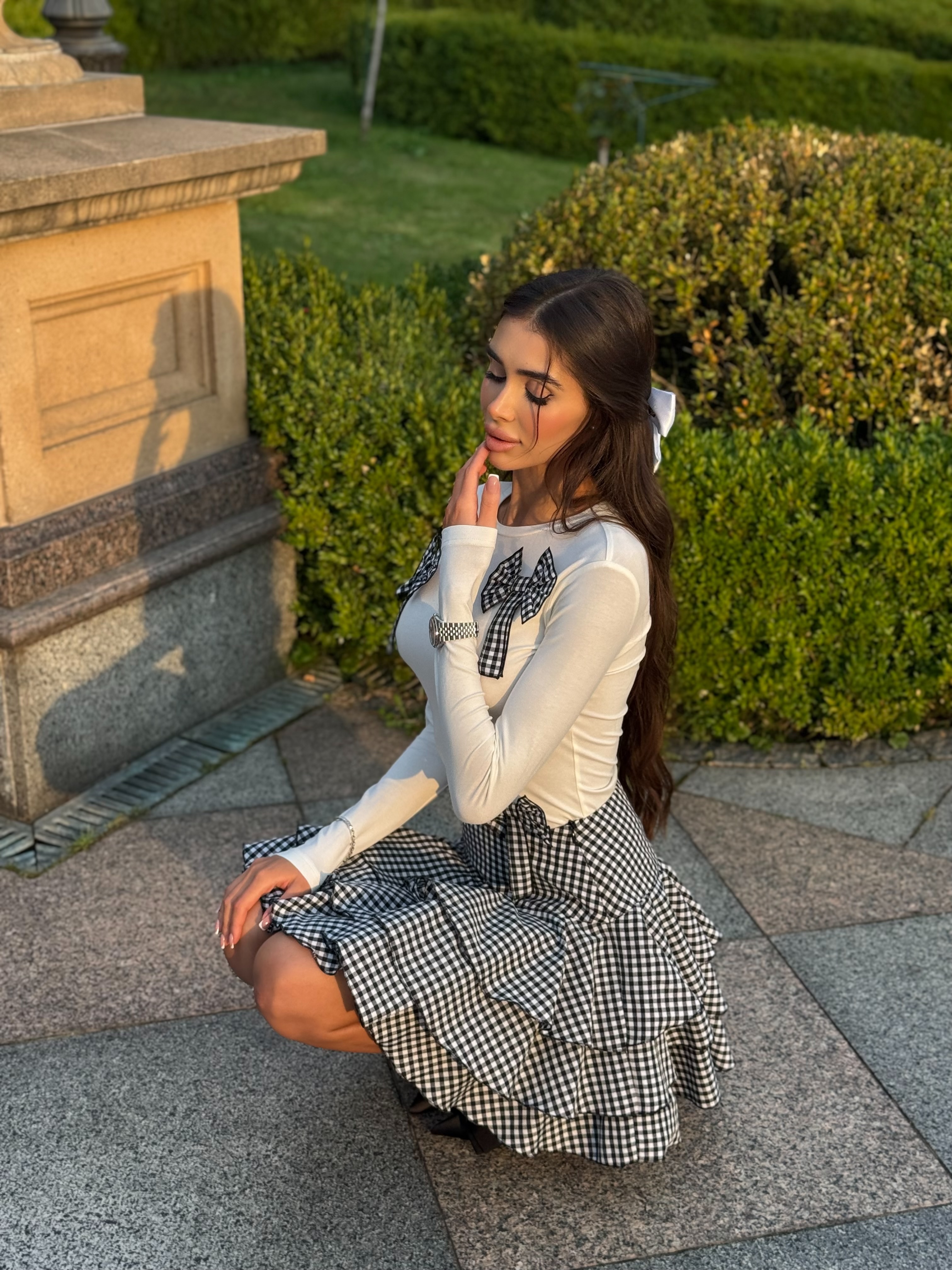 Костюм з двох одиниць: лонгслів - італійський трикотаж, декорований бантами, спідниця з рюшами - принтований котон, збоку на блискавці. Кольори: рожевий, чорний Розмір L виконується під замовлення клієнта, не підлягає обміну та поверненню!