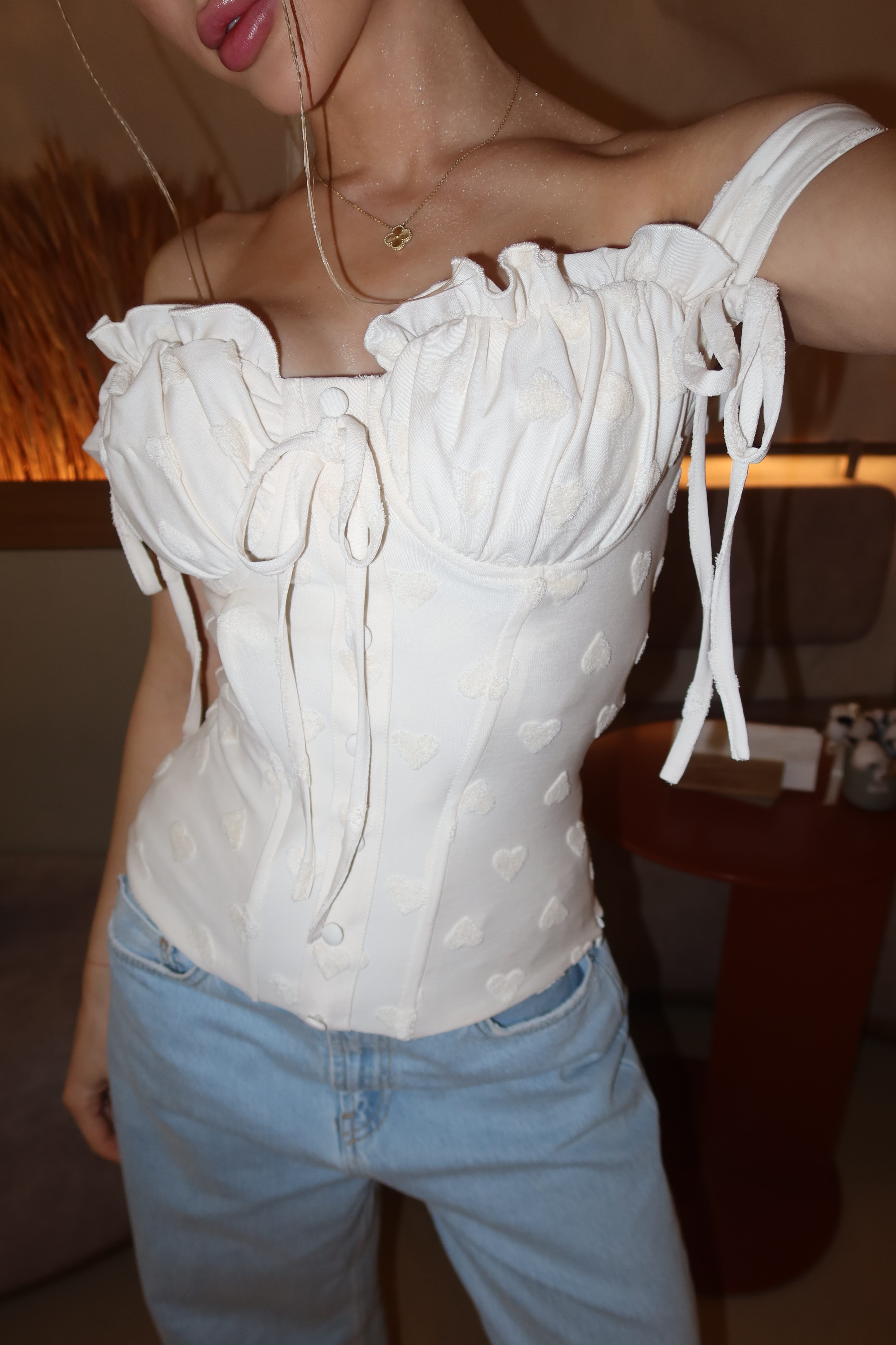 Топ SCARLETT4200 UAHsizeXSSMLadd_to_cartabout_meКорсетний топ SCARLETT виготовлений з жаккардового м'якого трикотажу молочного кольору. Топ з кісточками та збіркою на грудях, декорований зав'язками, збоку на блискавці. Розмір L виконується під замовлення клієнта, не підлягає обміну та поверненню!size_chartГрудиТаліяСтегнаXS80-8460-6487-91S85-8865-6892-95M89-9269-7297-100L93-9674-78101-104